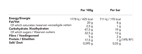 Ingredients: Date paste* (dates*, sunflower oil*), vegetable protein (pea)*, peanutbutter*